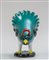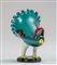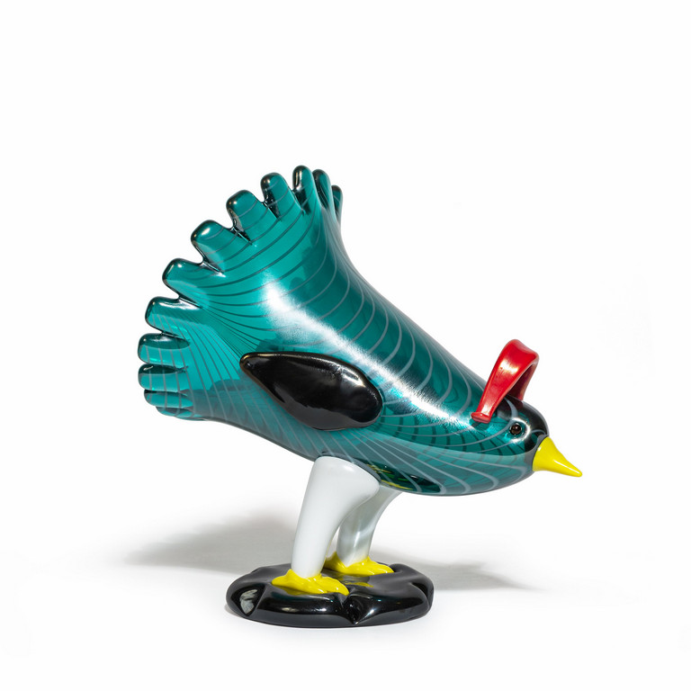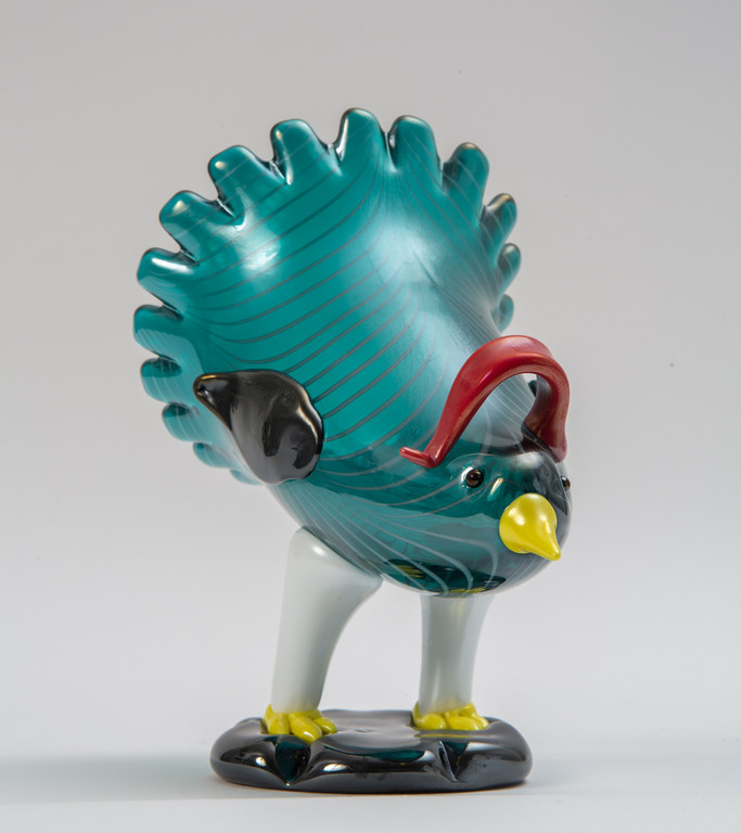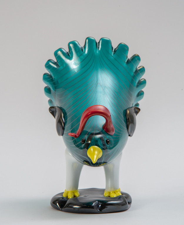 Una figura di gallina in vetro verde trasparente con decoro fenicio.