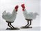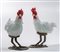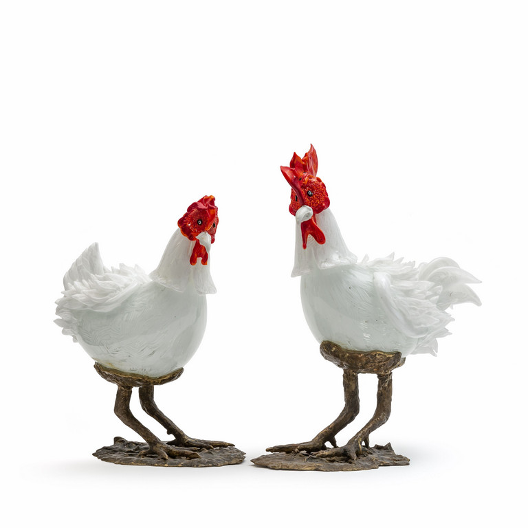 Figure di gallo e gallina in vetro a murene lattimo e teste in paste vitree basi in bronzo modellato.