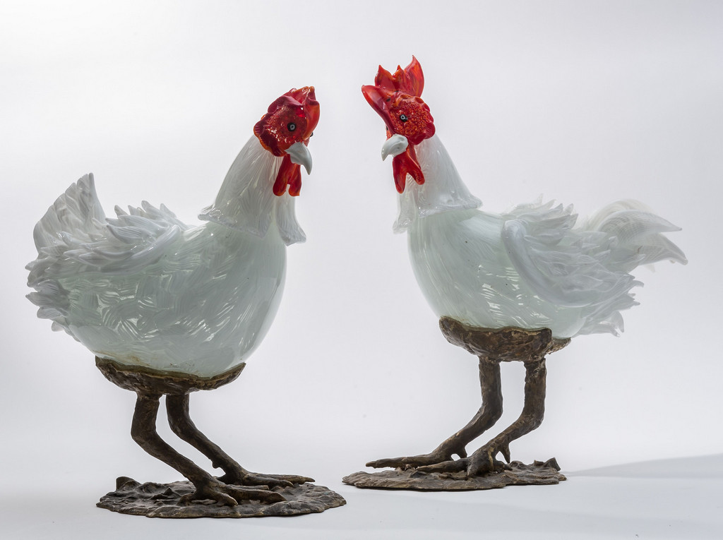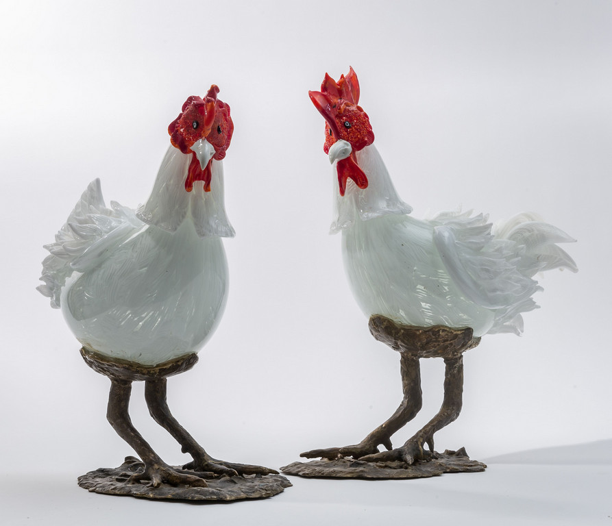 A rooster and a hen in murine of white lattimo glass and heads in glass pasta with shaped bronze base 1984.