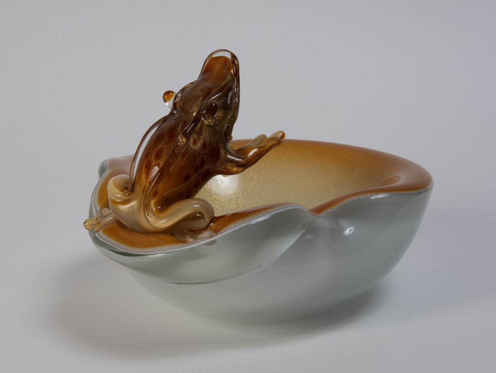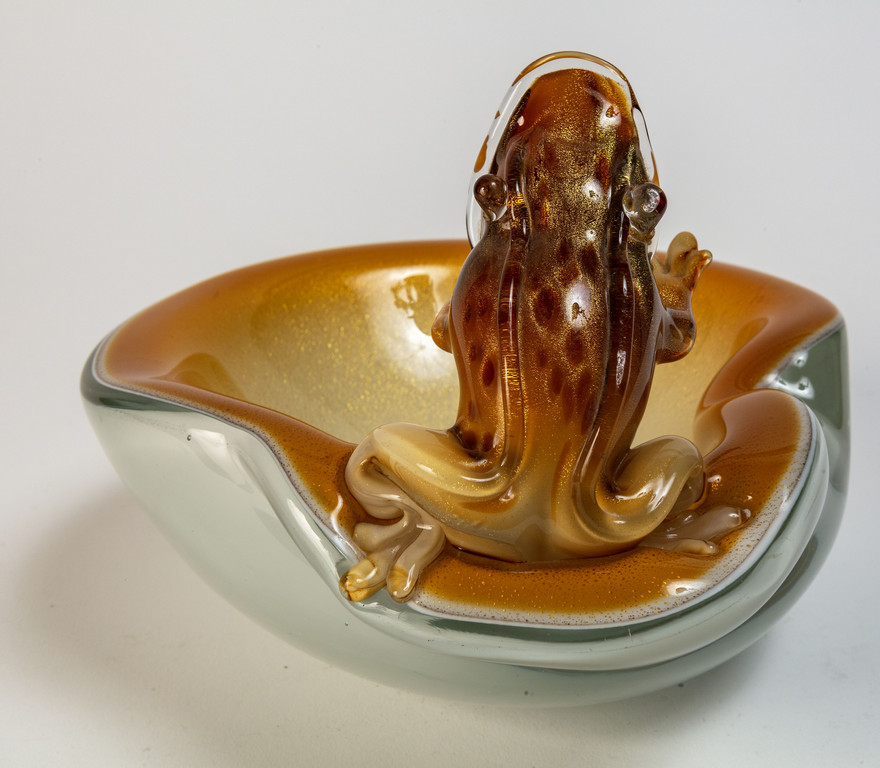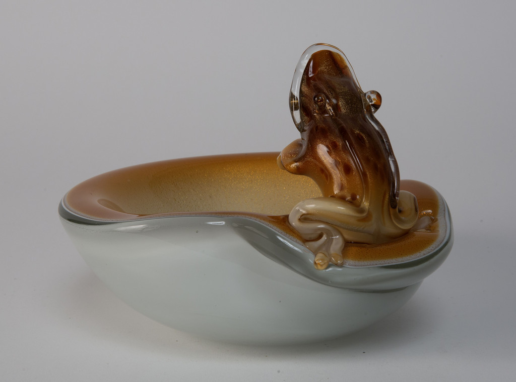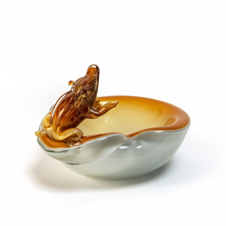 A bowl with a frog in heavy glass with gold leaf cased in white lattimo glass.