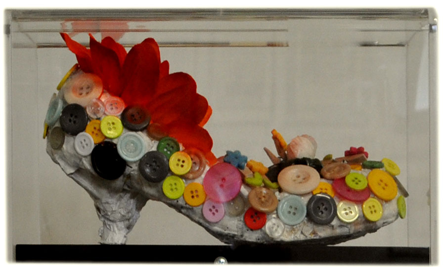 DANIELA BILLI Senza titolo Scarpa assemblata in teca di plexiglass cm. 17x28x13 firmata Foto autenticata dall’artista