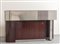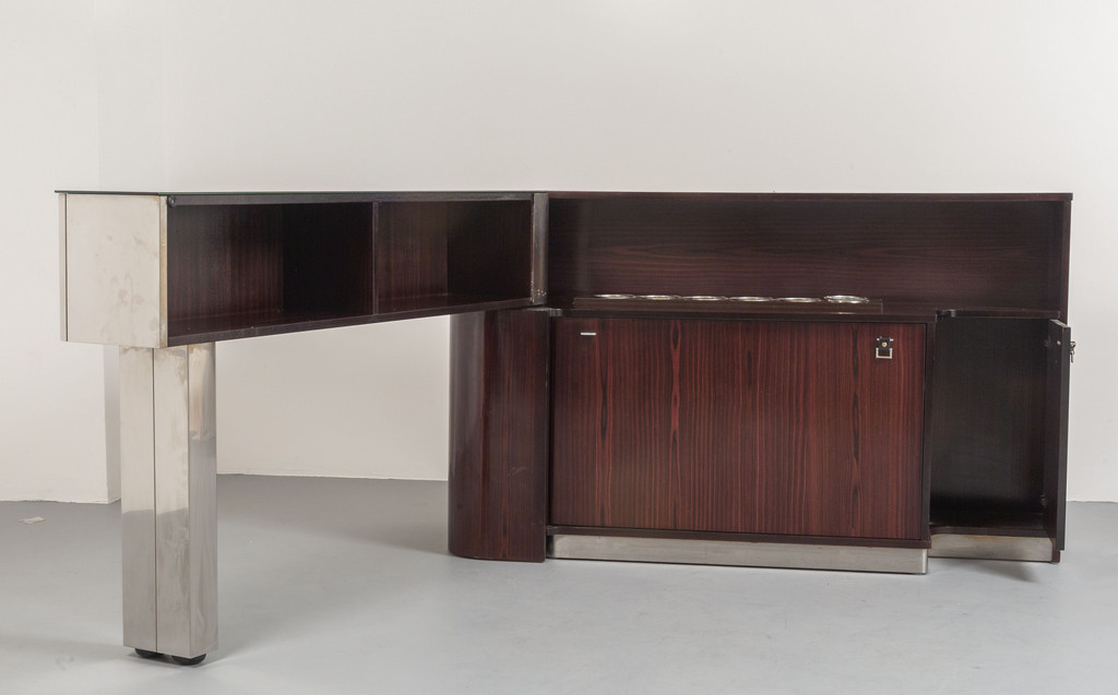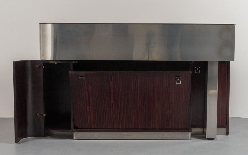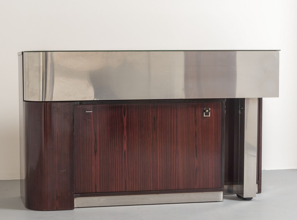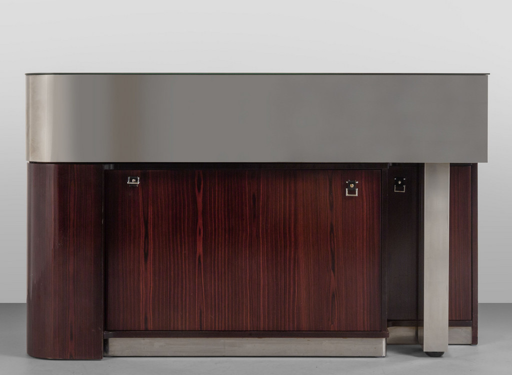 Acciaio nichelato spazzolato, legno impiallacciato palissandro, acciaio inossidabile, cristallo argentato.