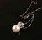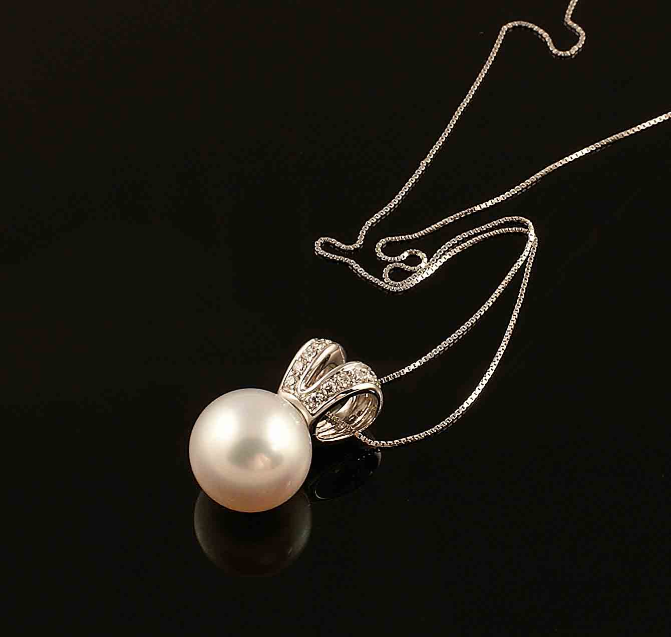 Pendente in oro bianco 18kt con incastonata una perla australiana di mm. 13 circa e diamanti taglio brillante per 0,20 punti circa, completo di catenina, gr. 7,8.