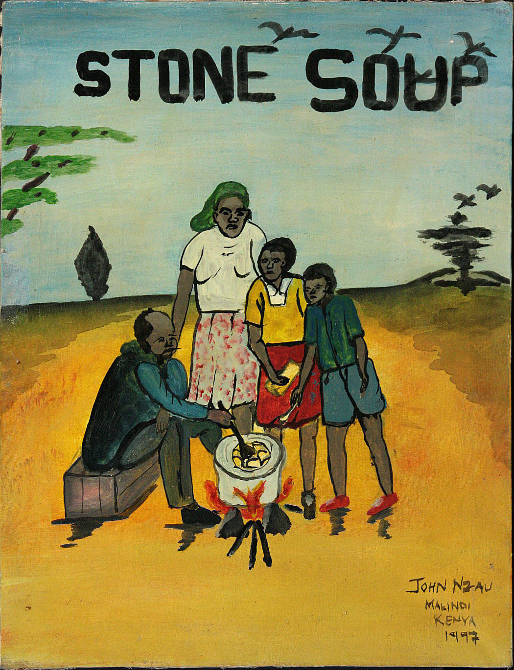 Lotto 205 | John Nzau (1964) Stone soup, 1997 Olio su tela cm 43x31 Firma e data in basso...