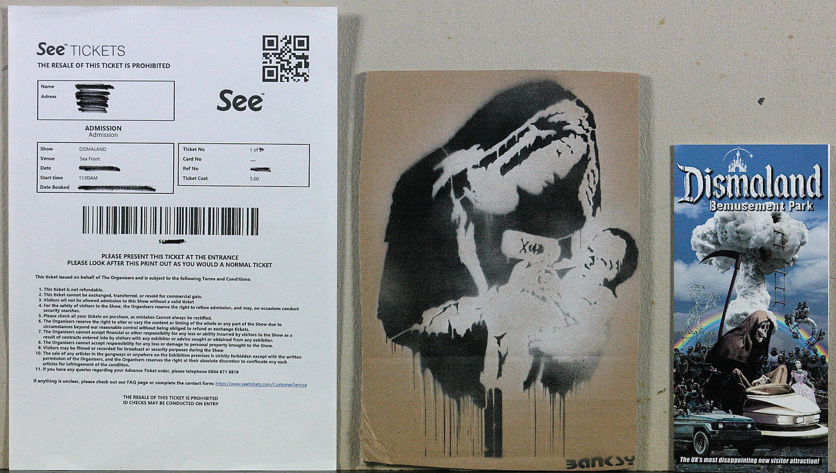 A corredo ticket d'ingresso a Dismaland e una brochure pieghevole di Dismaland.