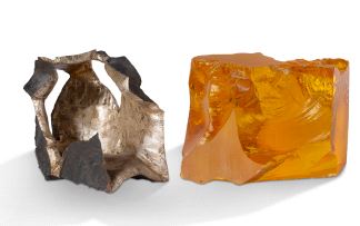 Sculpture en deux parties, en verre et bronze, signée et datée sur le bloc de verre