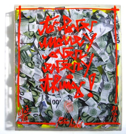 PETER HIDE Varese 1965 To love money over everything! 2011 Acrilico su tela con applicati fax simili di banconote da 100€ incluse da teca di plexiglass dipinta 31 x 26 x 4. Titolo in a. al c., firma in b. al c.; sul verso firme, data e titolo + timbro studio dell’artista. Autentica dell’autore su foto.