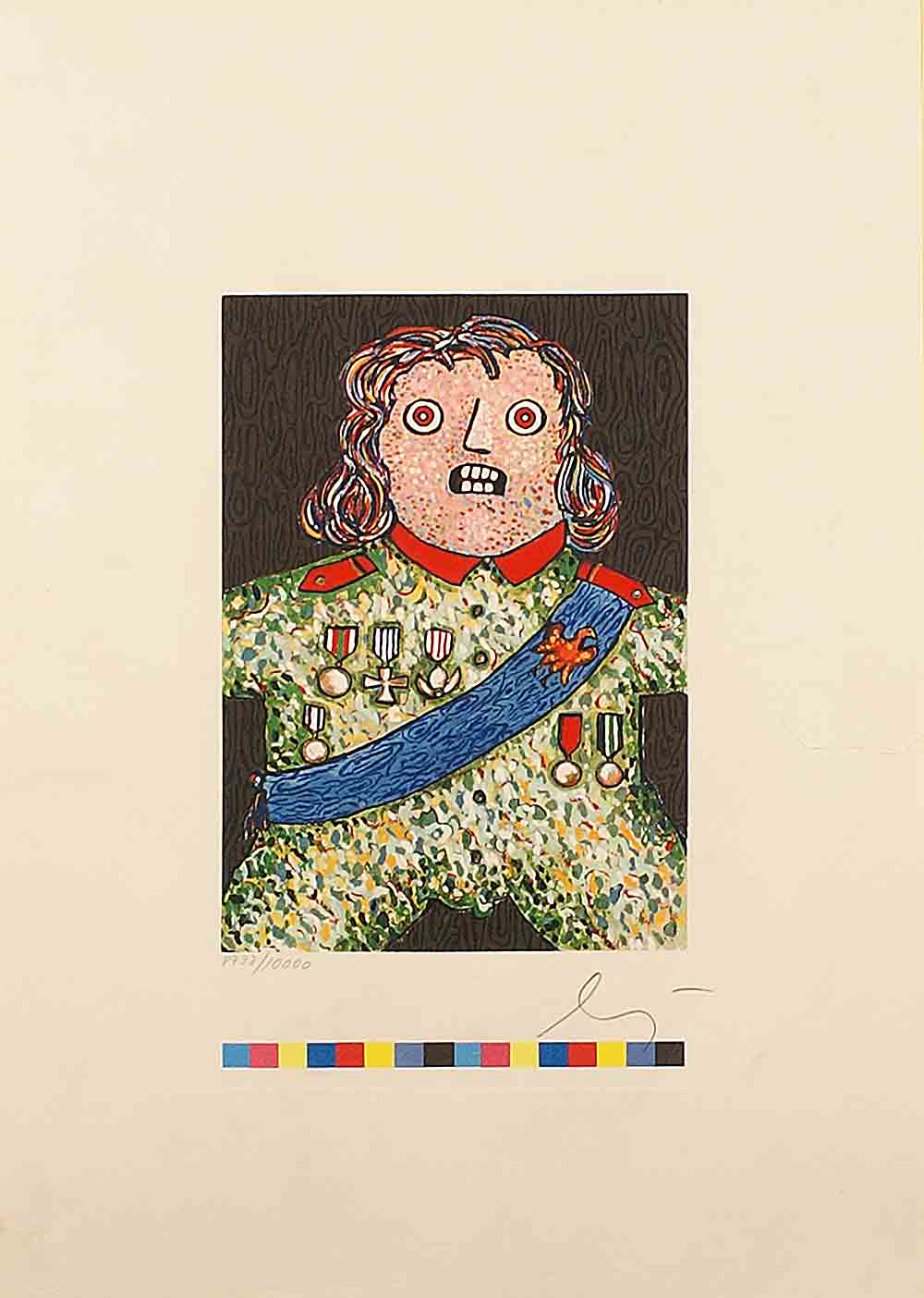 Enrico Baj (Milano 1924 - Vergiate 2003), "Il piccolo generale", acquaforte a dieci colori con finiture in bronzo e oro, es. 8733/10000, cm. 42x30, firmata in basso a destra.