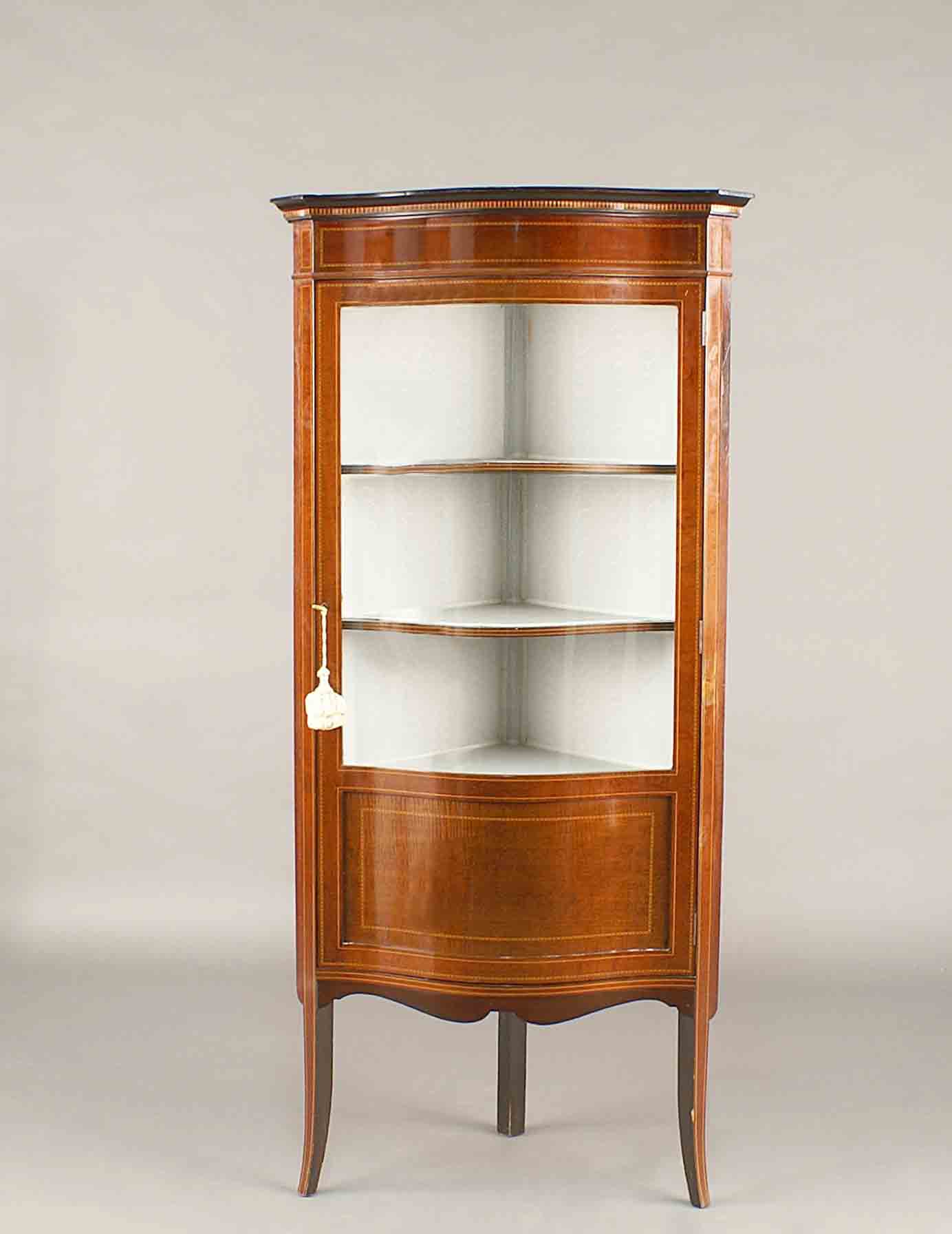 Vetrina angoliera in mogano filettato in legno di bosso, fronte ad uno sportello a vetro di linea curva con tre ripiani all' interno rivestiti in tessuto, Inghilterra, fine del XIX secolo, cm. 163x53x53.
