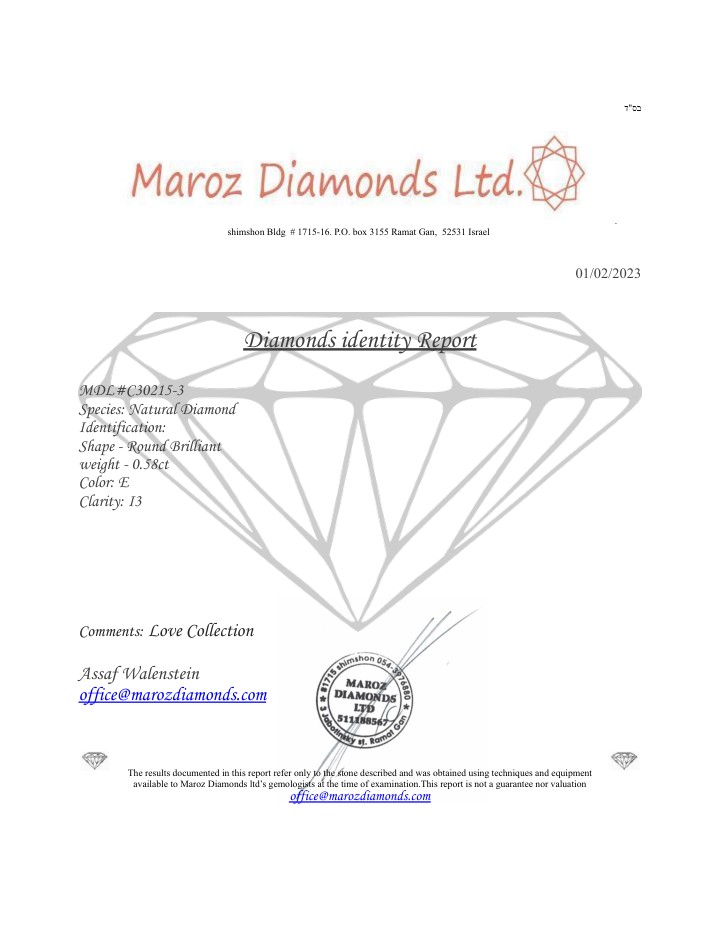 DIAMANTE 0,58 CT E - I2 - TAGLIO BRILLANTE - INCISO AL LASER + CERTIFICATO ID - C30215-3