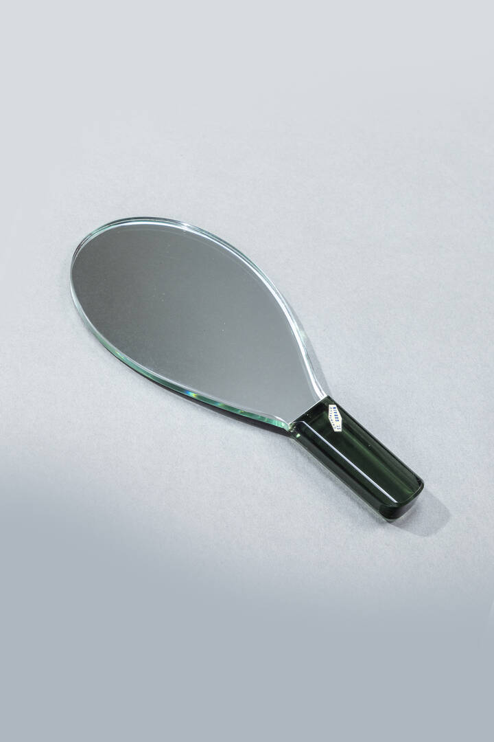 Specchio da tavolo con manico in vetro colorato di forte spessore e vetro specchiato.