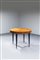 Tavolo con piano in legno bordo grissinato, cassetti a scomparsa, gambe coniche in legno laccato nero.