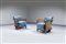 Coppia di poltrone con struttura in legno, paglia di vienna e cuscini imbottiti e rivestiti in velluto.