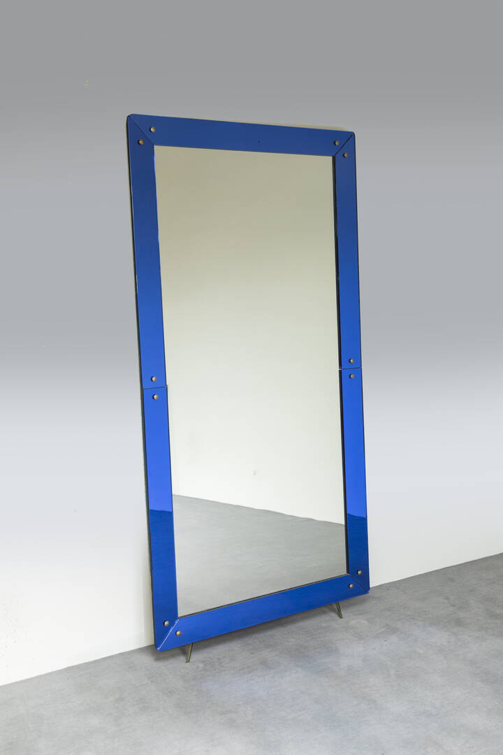 Specchiera con bordo di color blu in vetro molato e piedi in ottone.