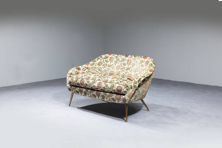 Divano con imbottitura rivestita in tessuto a fiori, piedi in ottone.