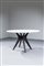 Tavolo con struttura in legno e piano rotondo in marmo bianco.