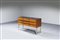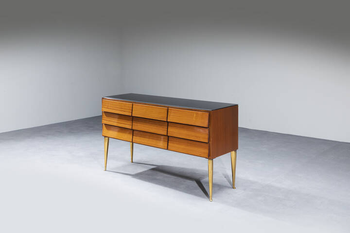 Cassettiera con struttura in legno impiallacciato, piano in vetro colorato,gambe in ottone.