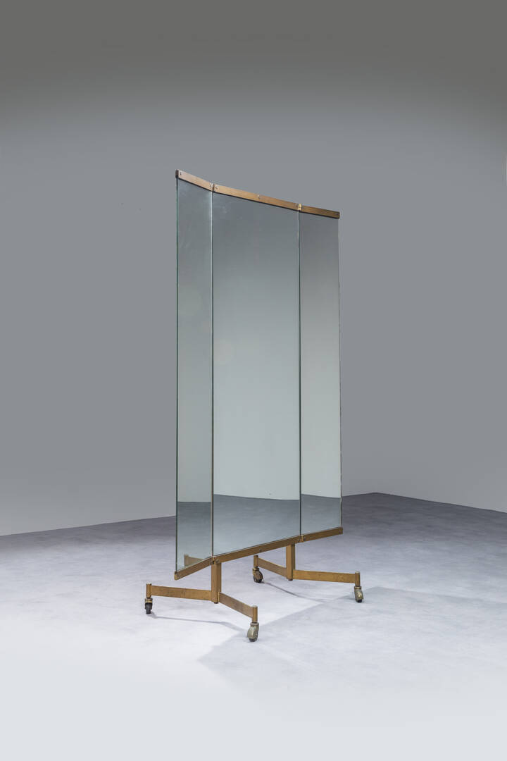 Specchio con struttura in ferro verniciato, ottone e vetro specchiato.