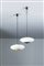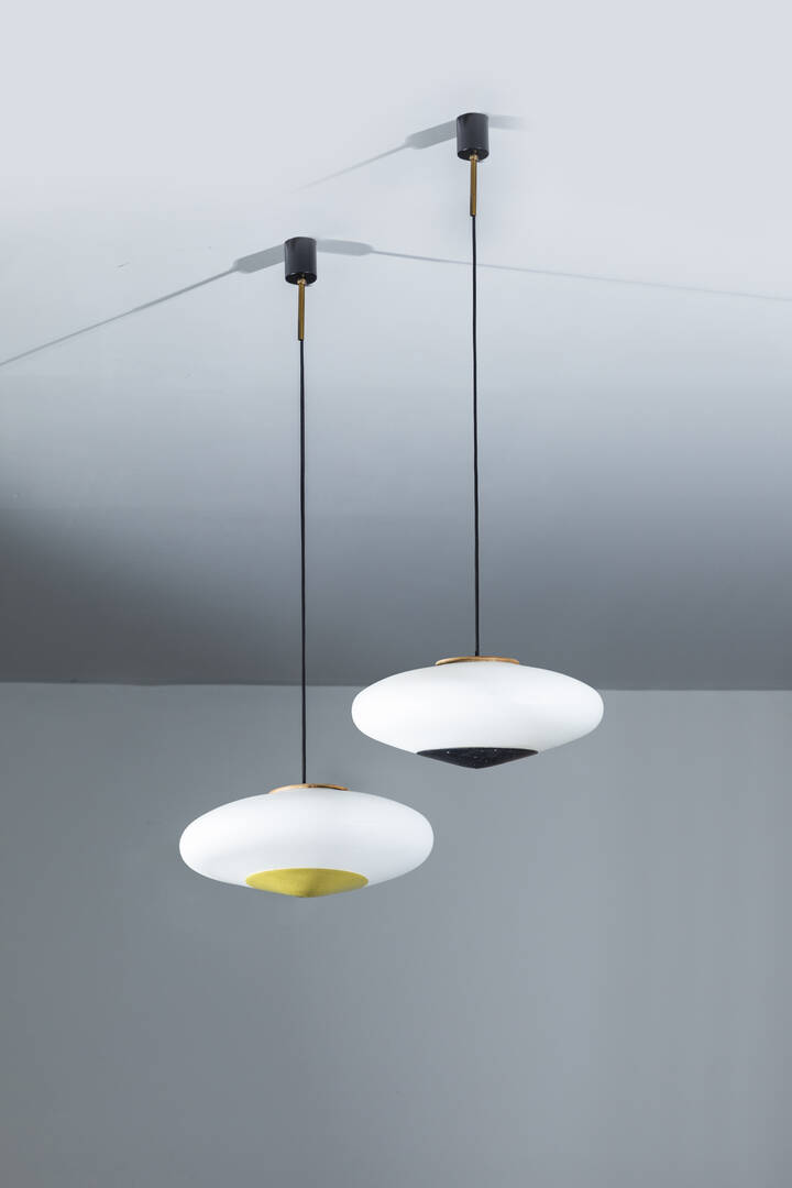 Coppia di lampadari con vetro satinato e metallo verniciato.