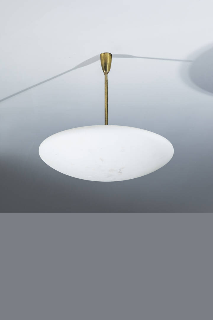 Lampadario con struttura in ottone e diffusore in vetro satinato.