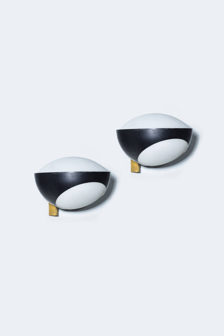 Coppette di vetro, diffusore bianco satinato, montatura in metallo laccato e ottone spazzolato.