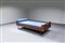 Sostegni in tondino di ferro laccato, struttura in legno, compensato curvato, particolari in ottone e rivestimento in tessuto.
