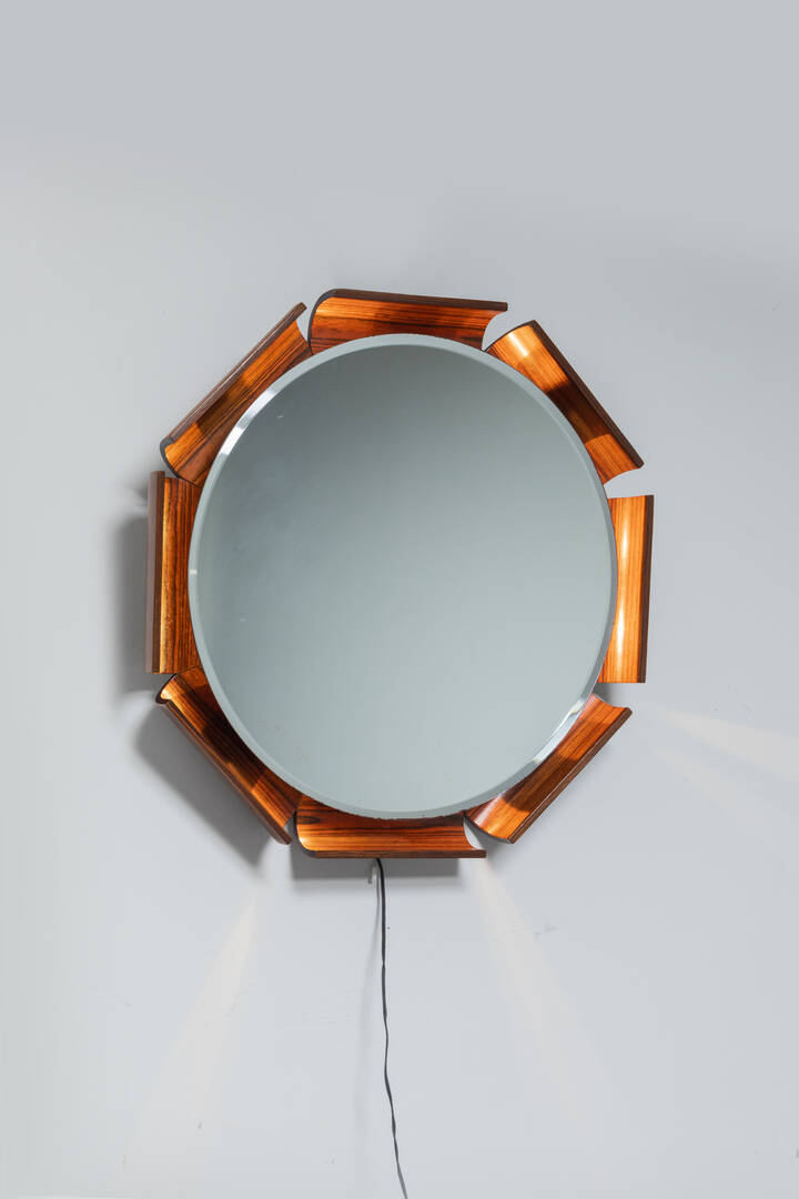 Struttura in compensato curvato con specchiera retro illuminata.
