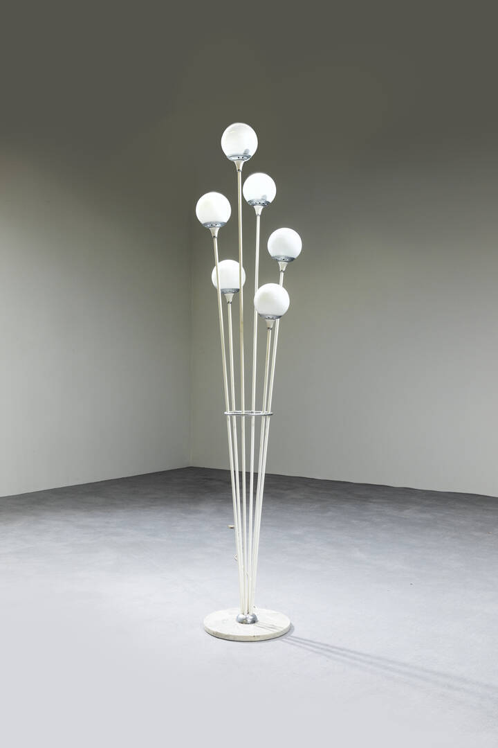 Lampada da terra Alberello con struttura in metallo laccato, particolari in metallo cromato, base in marmo e diffusori in vetro opalino.
