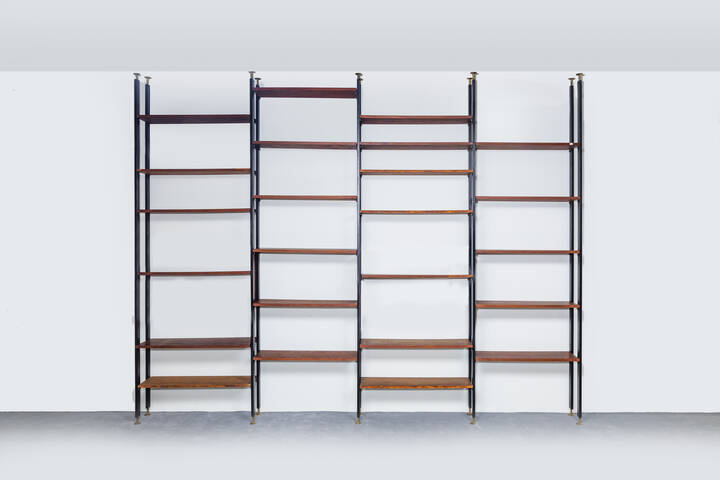 Grande libreria cielo/terra, doppio montante in ferro smaltato, piani in legno e particolari in ottone.