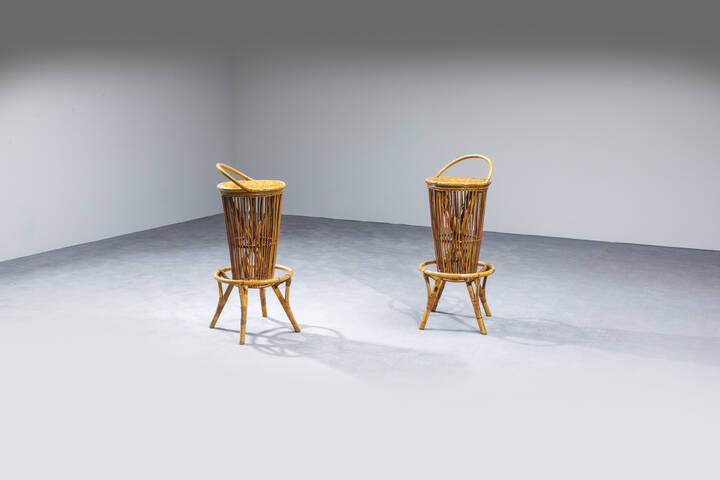 Precedente Lotto 178 Successivo Sant’Agostino - Corso Tassoni 56, 10144 Torino Asta 219 Design Sessione unica giovedì 13 aprile 2023 ore 15:00 (UTC +01:00) PRODUZIONE ITALIANA PRODUZIONE ITALIANACoppia di sgabelli in vimini.Anni '60cm 89x34