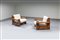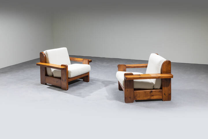 Coppia di grandi poltrone in stile rustico con struttura in legno e imbottitura rivestita in tessuto.