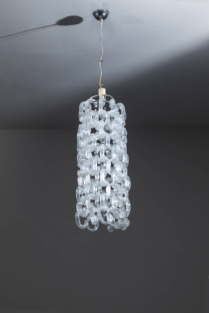 Lampadario con struttura in metallo ed elementi diffusori componibili in vetro di Murano.