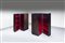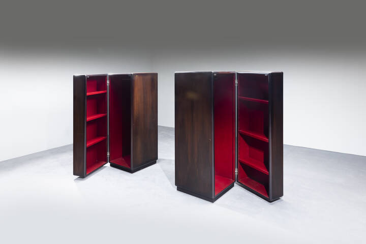 Coppia di mobili portabiti in legno, interno rivestito in legno laminato rosso.