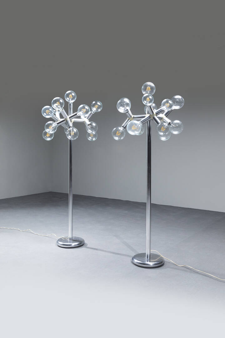 Coppia di lampade da terra in alluminio, base in ghisa e particolari in plastica.