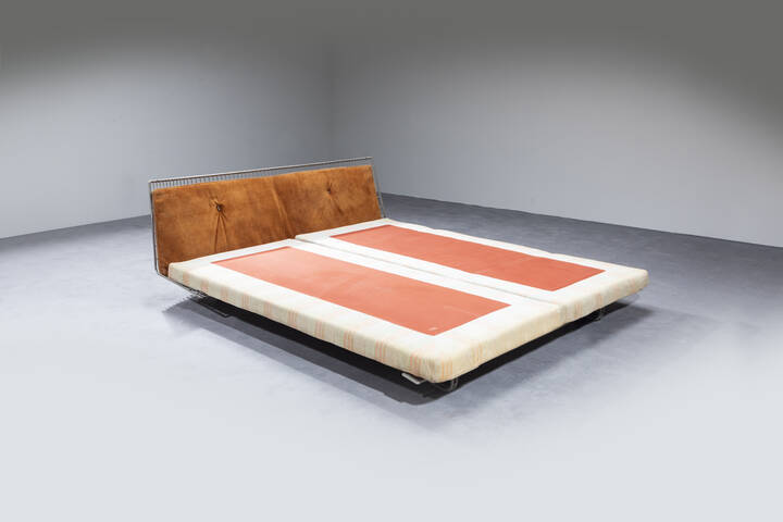 Letto con struttura in acciaio e testiera rivestita in pelle.