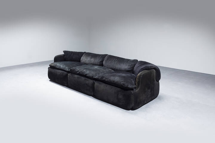 Divano a tre posti in materiale plastico e rivestimento in alcantara.