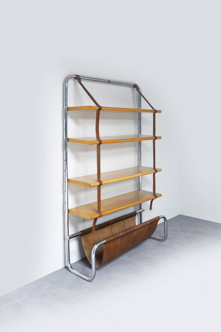 Libreria "Jumbo line" con struttura in acciaio cromato, pelle, legno naturale.