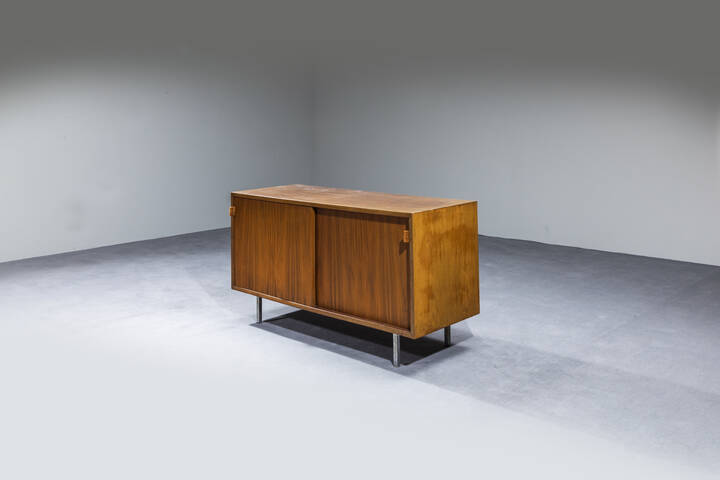 Mobile contenitore in legno con ante scorrevoli e piedi in acciaio cromato.