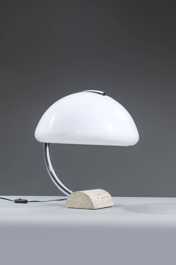 Base in travertino, struttura in metallo cromato e paralume in perspex.