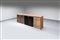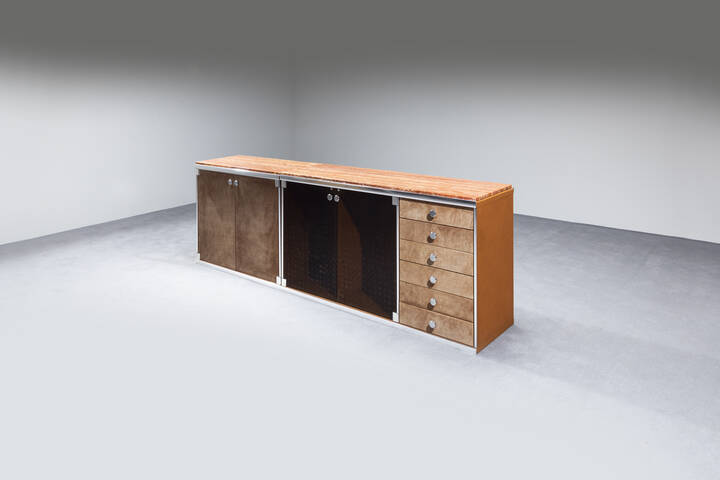 Credenza da due elementi con struttura rivestita velluto,profili in acciaio satinato e piano in marmo.