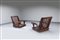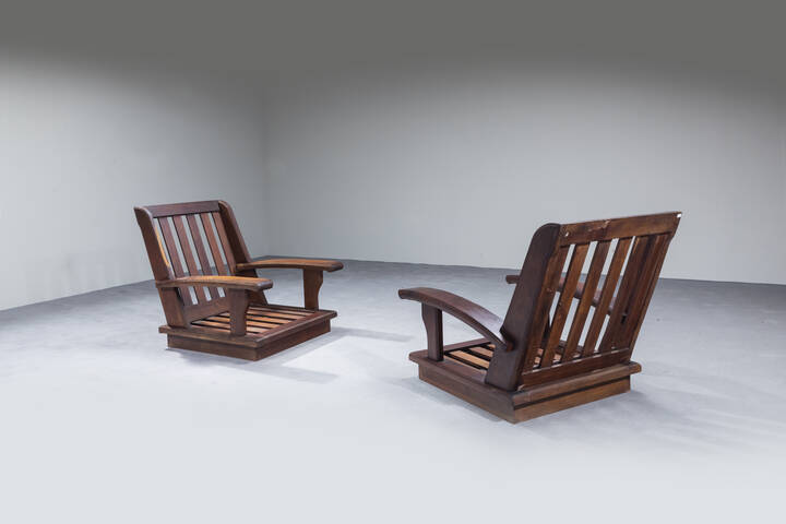 Coppia di poltrone in legno di rovere, cuscini imbottiti rivestiti in tessuto.
