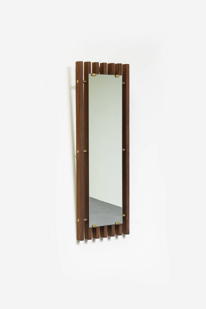 Specchio con struttura listellare in legno e ottone, cristallo specchiato.