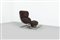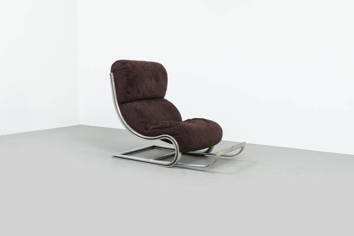 Poltrona con poggiapiedi estraibili in acciaio, imbottitura rivestita in tessuto.