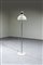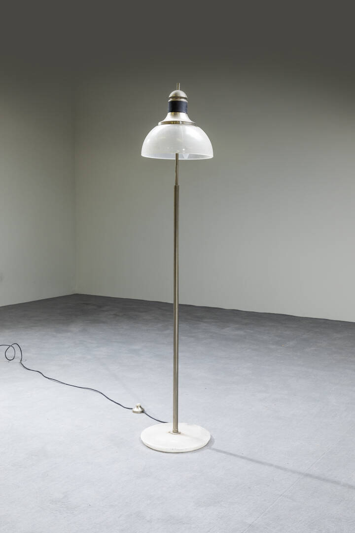 Lampada da terra con base in marmo, struttura in metallo e paralume in vetro.