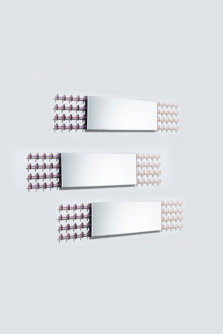 Specchio composto da tre elementi con struttura in legno ed elementi decorativi in vetro di Murano e metallo laccato.