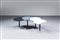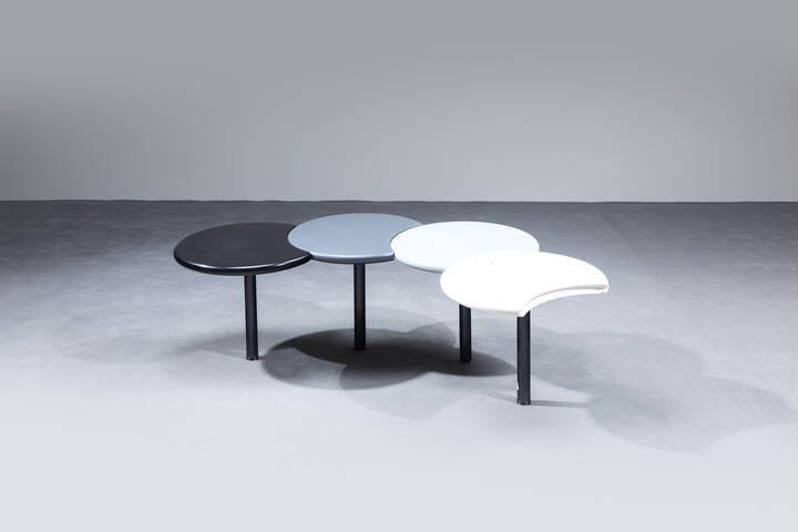 Tavolino in legno laccato formato da quattro cerchi mobili poggianti su basi in legno laccato.