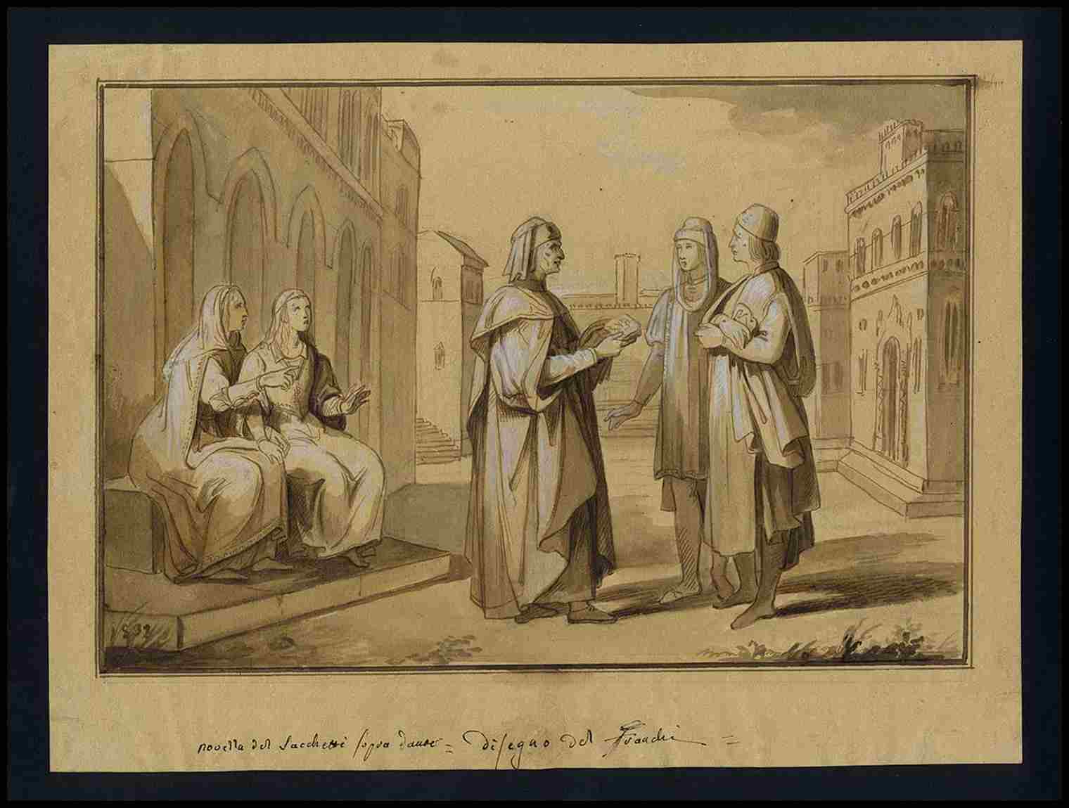 Il disegno reca al recto, al margine inferiore, iscrizione a inchiostro: "NOVELLA DEL SACCHETTI SOPRA DANTE. DISEGNO DEL FRANCHI"