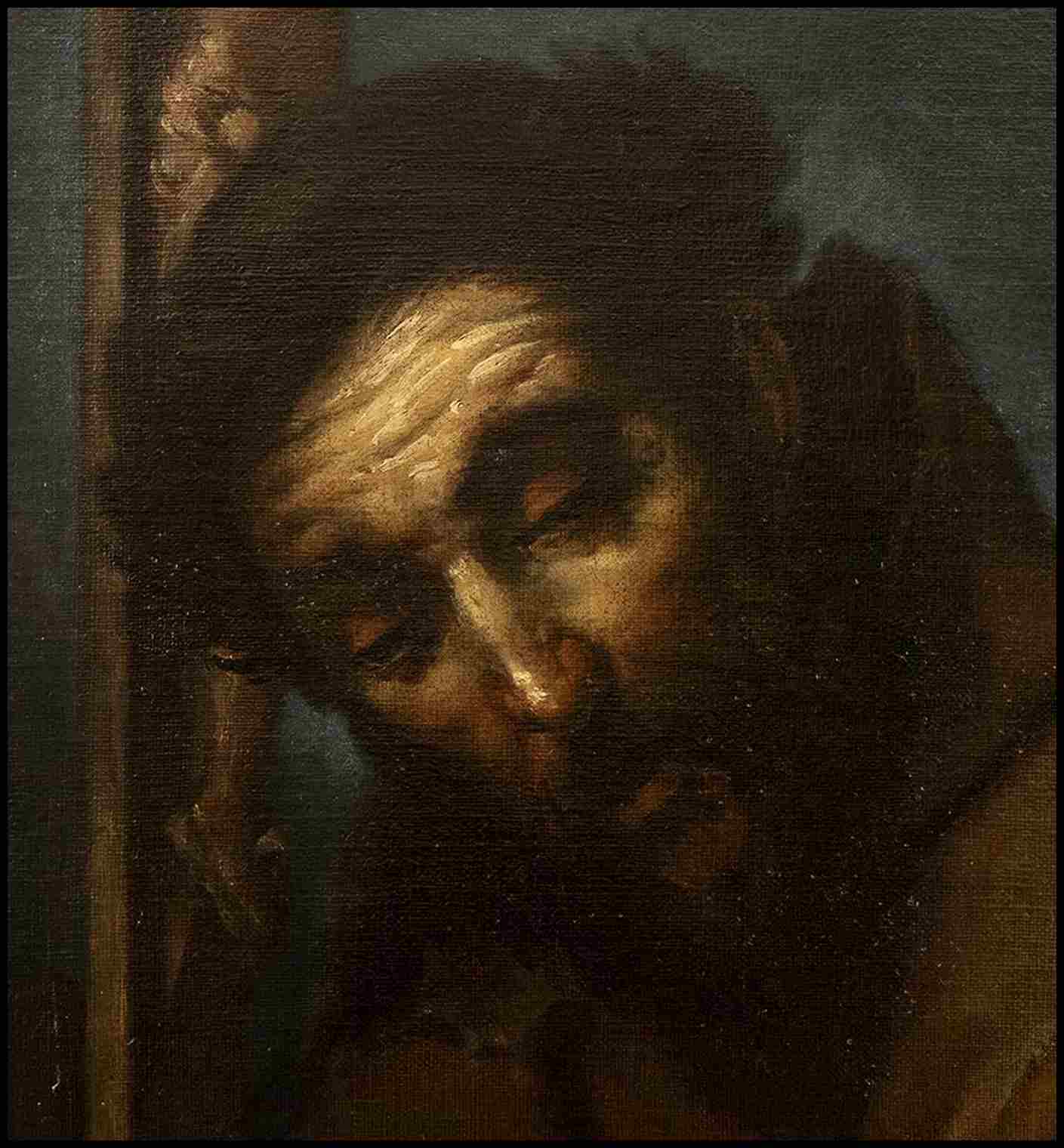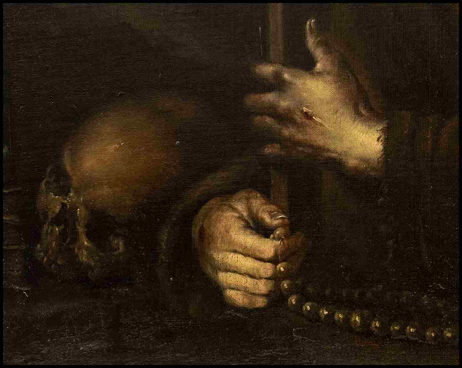 Il tema di San Francesco in estasi, in preghiera o abbracciato al crocifisso, è tra quelli più ricorrenti e felicemente risolti nel corpus delle opere sacre di destinazione devozionale di Bernardo Strozzi. Tale soggetto si rivelò, in effetti, particolarmente congeniale sia all’essenzialità e concisione del suo estro compositivo, sia all’intensità emotiva che Strozzi era incline ad assegnare alle pose e alle espressioni delle sue figure. La mirabile tela che qui si presenta rielabora, con significative aggiunte e varianti, l’impianto del San Francesco abbracciato alla croce oggi conservato al Museo di Palazzo Rosso a Genova, che dovrebbe corrispondere al prototipo della serie iconografica, più volte replicato da Strozzi e dai suoi aiuti. In aggiunta troviamo qui l’importante inserzione del superbo inserto naturamortistico, che include, accanto al teschio, gli altri principali emblemi della vanitas, clessidra e volumi chiusi, e che richiama le analoghe soluzioni figurative nelle due versioni del San Francesco in preghiera davanti al crocifisso della Pinacoteca Nazionale di Siena e del Wellesley College Museum. Con queste ultime, e con altre effigi a figura singola di Francesco, la nostra tela condivide anche la scultura lignea del Cristo in croce, coi motivi del disco piatto dell’aureola e della corona con le spine aguzze marcatamente sporgenti, evidentemente ripresa da uno stesso esemplare a disposizione nell’atelier dell’artista. Nella versione qui in oggetto il cricifisso è raffigurato più di tre quarti, una scelta che risulta perfettamente coerente con l’impegno che l’artista profuse in questa tela per produrre il massimo coinvolgimento patetico dello spettatore. Essi si combina, infatti, con l’intensità particolarmente sofferta del volto del santo, grazie alla sottolineatura naturalistica delle rughe profonde della fronte, delle guance scavate e degli occhi socchiusi e immersi nell’ombra, che conferiscono a quest’immagine un timbro dolente superiore a tutte le altre versioni note del soggetto.