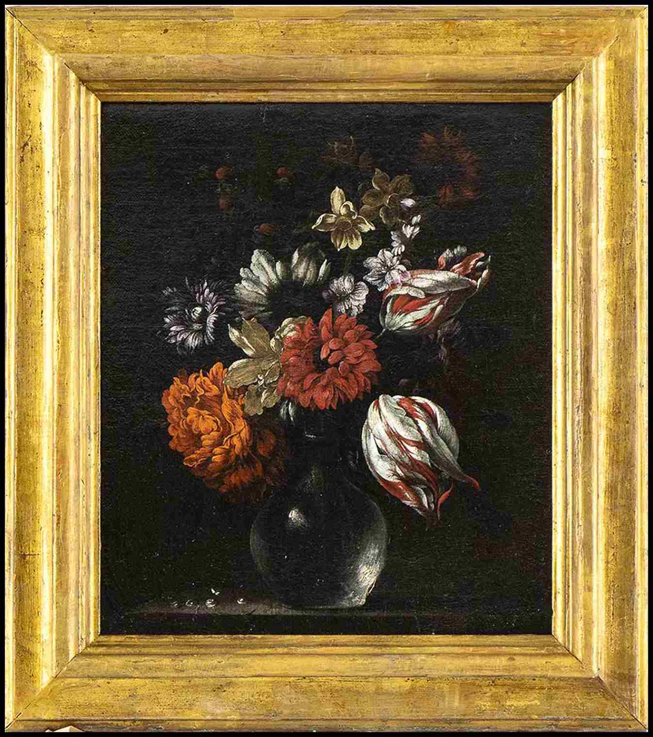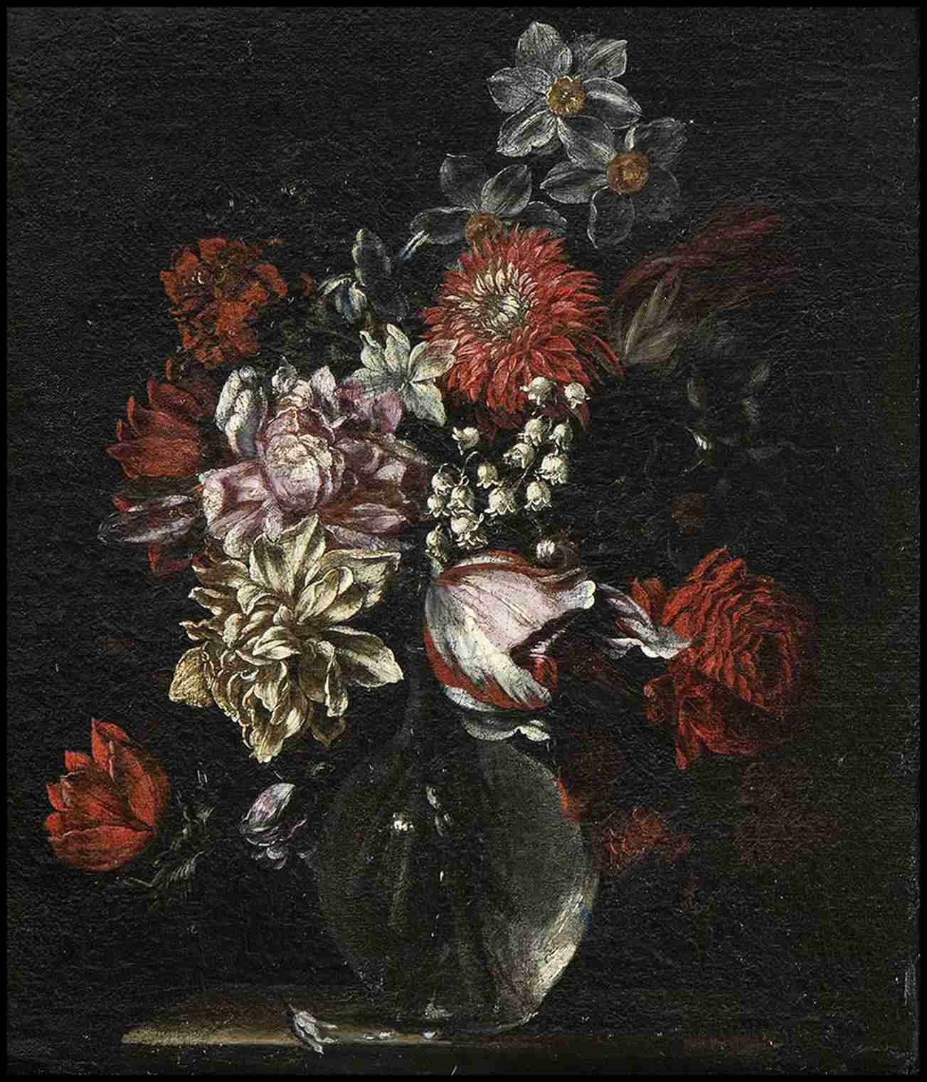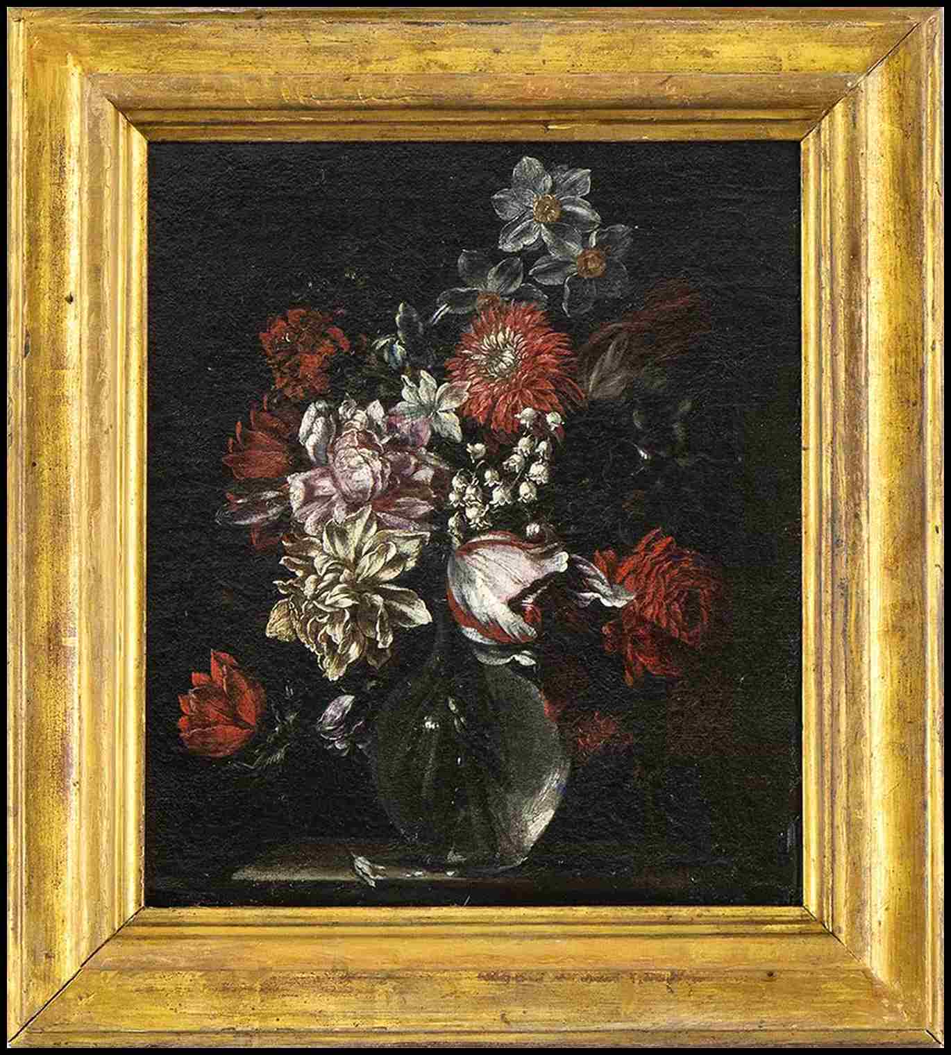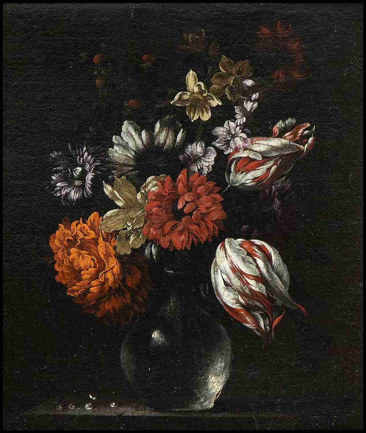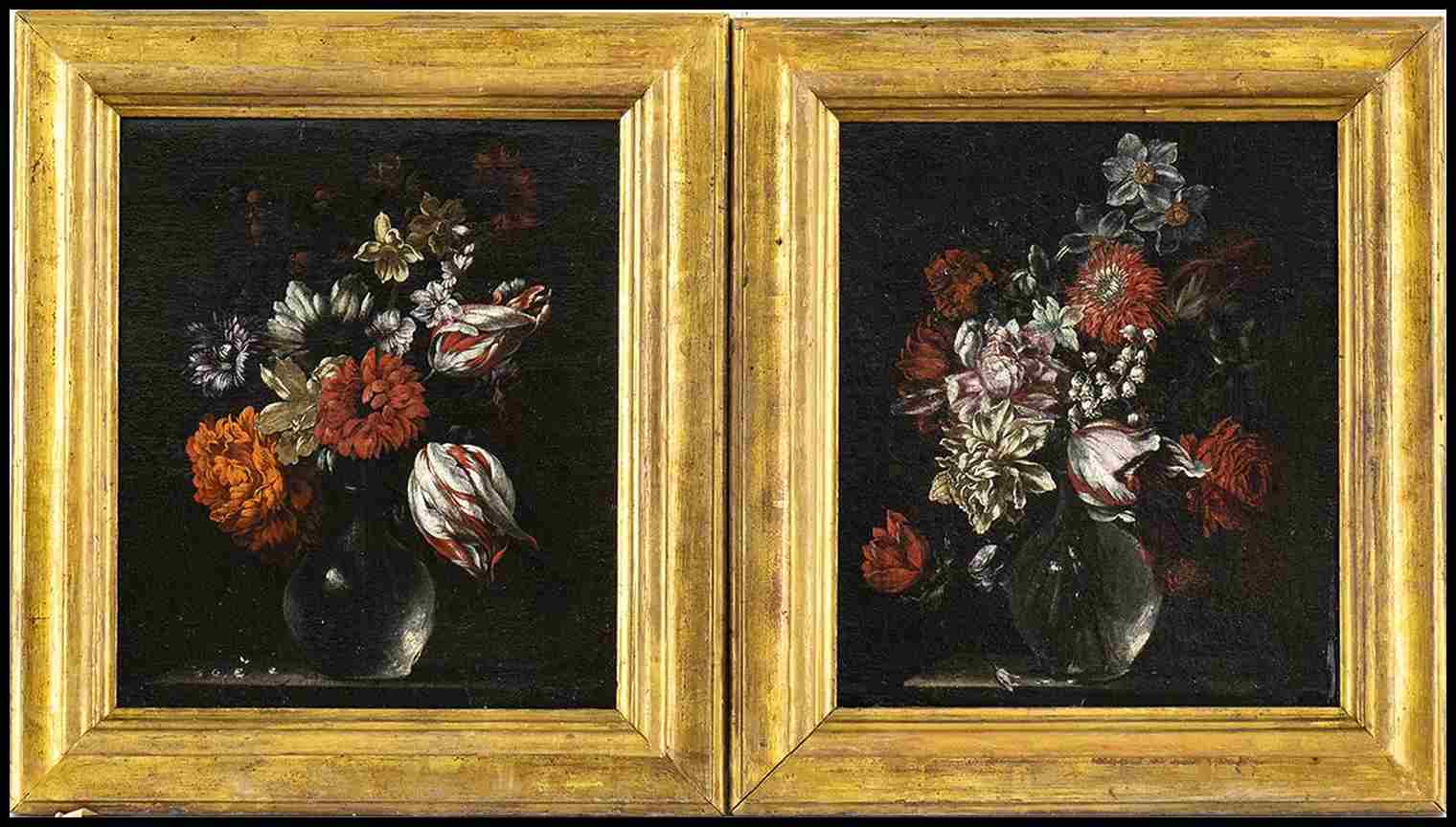 a) Natura morta di crisantemi, narcisi e tulipani; b) Natura morta con rose , tulipano e mughetto. Coppia di dipinti