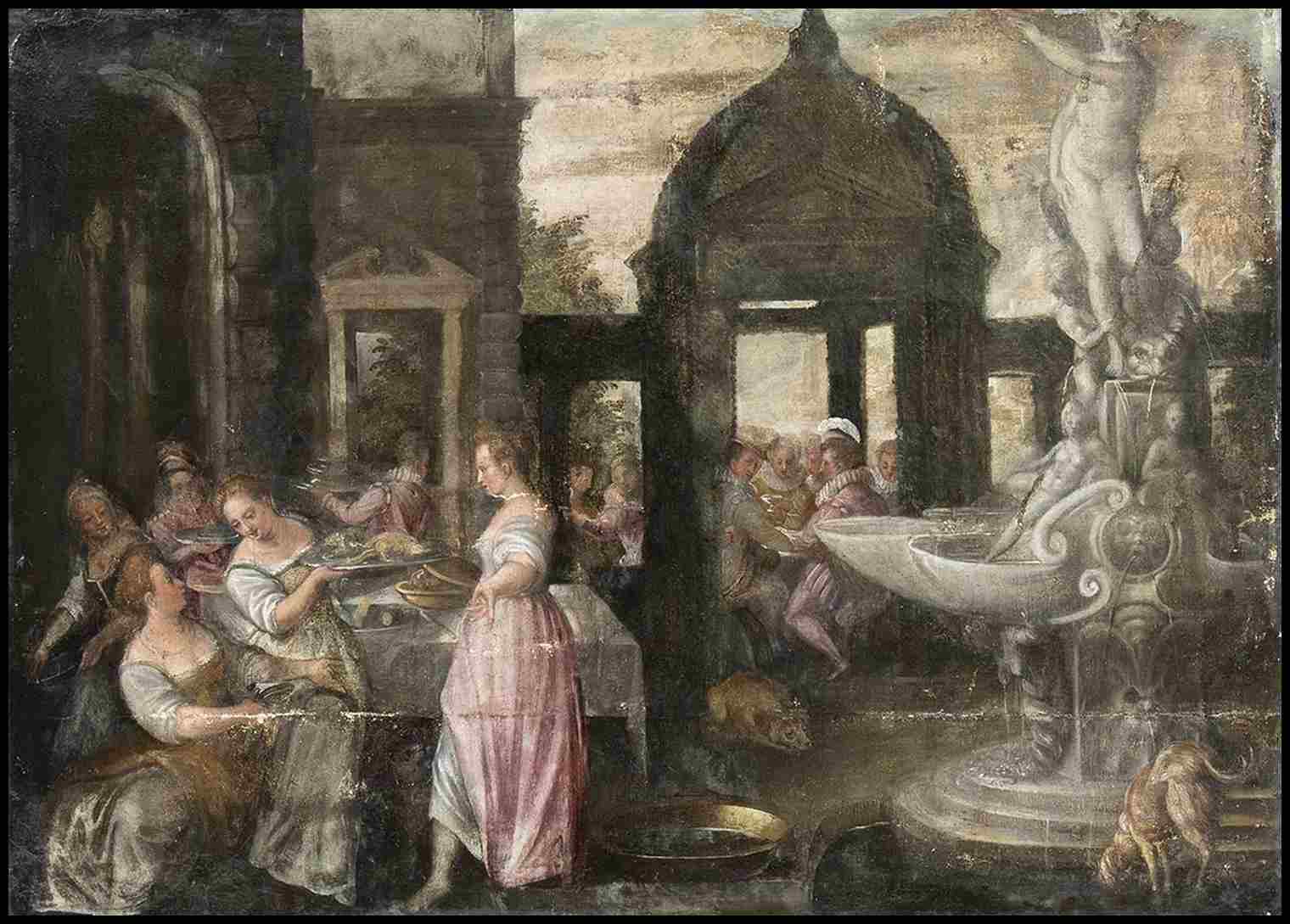 Questa elegante scena di banchetto, ambientata nel giardino di una villa cinquecentesca di stile tardo-rinascimentale, tra Giulio Romano e Palladio, e ingentilita da una monumentale fontana di marmo di gusto manierista, tra Ammannati e Giambologna, parla un linguaggio pittorico inequivocabilmente veneto, legato in particolare all’esempio di Paolo Veronese, arricchito però da chiare inflessioni fiamminghe. La felice combinazione che qui si realizza di eleganza classicista, estro narrativo, ricchezza decorativa, minuziosa notazione realista, indirizza questa grande tela verso Lodewijk Toeput detto il Pozzoserrato, tra i migliori artisti nordici attivi in Veneto nella seconda metà del Cinquecento.